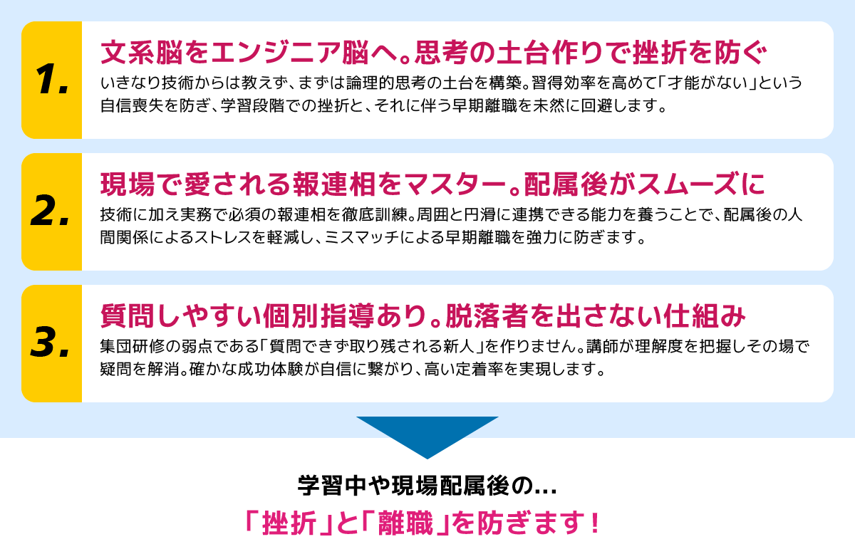 理系採用が困難な今、文系新人の戦力化は不可欠です。文系特有の不安を解消できるこの研修で挫折を未然に防ぎ、現場が求める「辞めない人材」へと確実に育て上げます。
